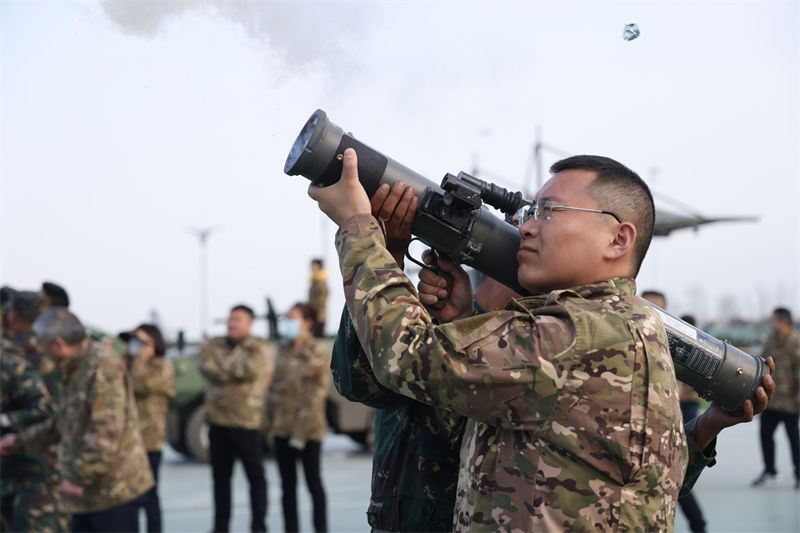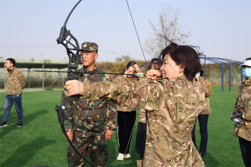 随后,全体学员在教官的指导下,体验了摧毁暗堡(手榴弹投掷)、草靶射箭、小推车体验、步枪激光打靶、装甲车体验、彩虹滑道体验等一系列户外拓展项目。