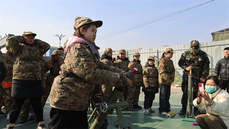 宽阔的训练场上,孩子们身着迷彩服,整齐列队,在教官的指导下,依次体验了超越式军训、破冰、火箭筒、迫击炮、消防课程、抢球大战、激光打靶、摧毁暗堡、彩虹滑道、驾驶小坦克等丰富多彩的特色课程。午饭前,孩子们还齐诵餐前训导,谨记“一粥一饭当思来之不易”。