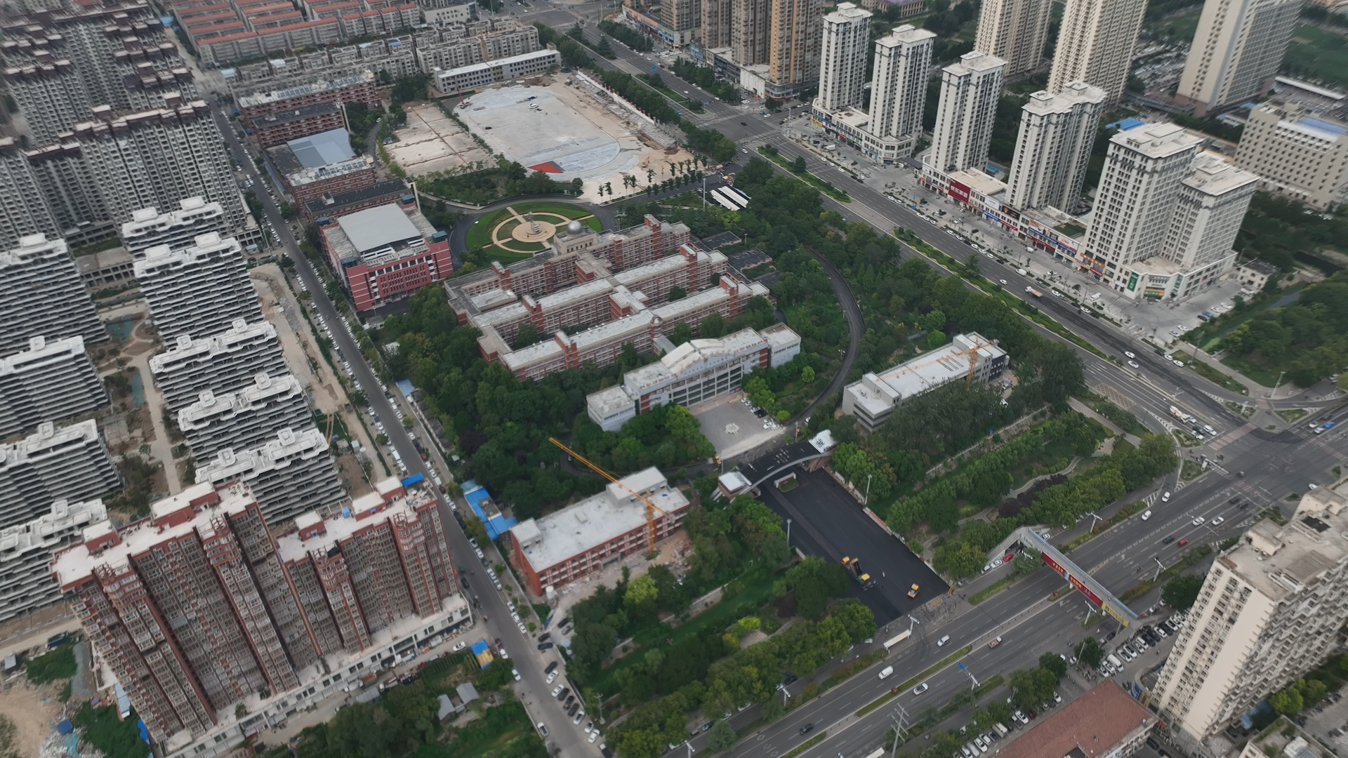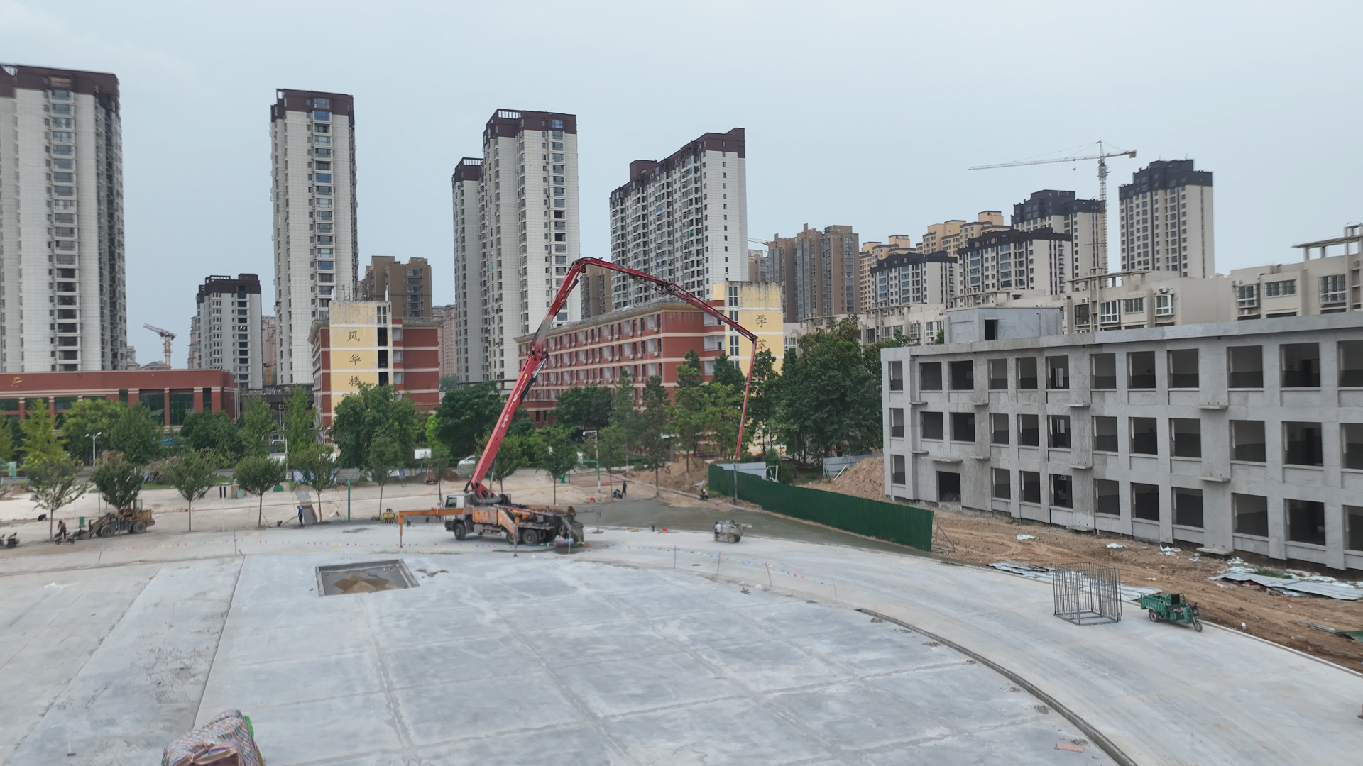 在项目推进过程中,市城建集团严格把控工程质量与进度。目前,教学楼、宿舍楼、科创楼主体验收已顺利通过,内外粉刷完成100%,屋面工程完成100%。内墙漆腻子完成58%,消防水电安装完成58%,窗户安装完成40%,外墙真石漆完成20%。校区内道路沥青罩面完成50%,塑胶跑道完成5%,操场看台地砖完成20%,篮球场排水沟完成70%。