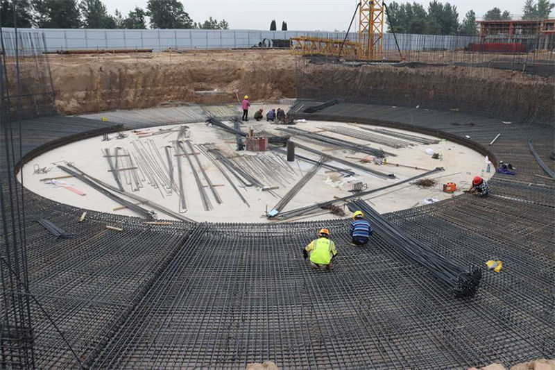 据城建集团筹建负责人刘少杰介绍,第七污水处理厂总设计容量6万吨,占地40余亩,第一期工程预计建设容量3万吨。自五月初人员设备进场以来,集团狠抓施工质量及施工进度,抢抓工期,目前共投入施工人员180余人,四座大型塔吊协同作业为工人做配套服务,在保证施工人员安全的情况下,早上六点上班,晚上十点下班全天候进行施工作业。生化池、二沉池正在进行底板钢筋绑扎,高效反应滤池垫层已浇筑完成,紫外线消毒池、纤维转盘滤池池壁钢筋正在进行绑扎,综合楼二层混凝土浇筑已完成,预计十月份将进行试水。