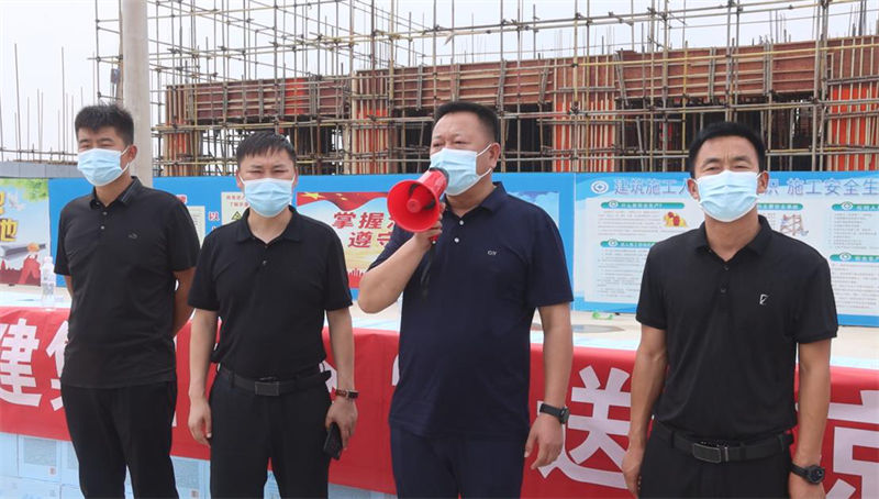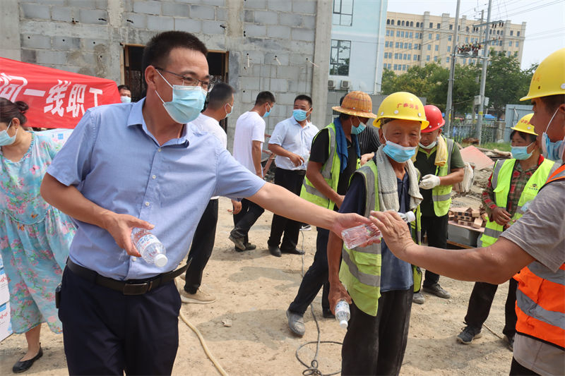在施工现场,慰问组一行与大家亲切交流,询问项目建设情况、施工进度和工人工作环境,叮嘱他们一定要注意防暑降温,适时调整作息时间,把安全问题放在首位,把防暑降温工作和安全工作相结合,保障工程施工工作平稳有序地开展,并亲自将防暑降温物品送到工人手中。