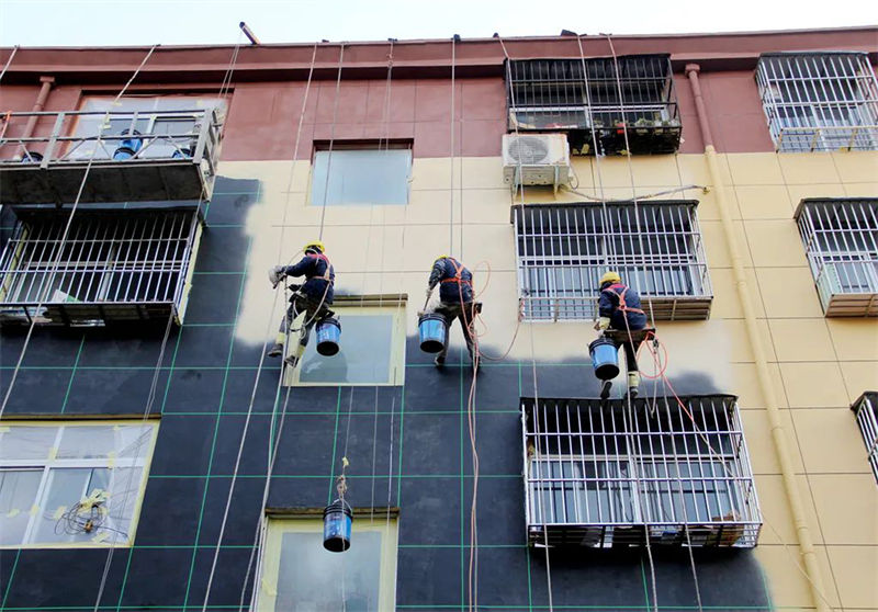 另一栋居民楼,市城建集团的几名工人从楼顶自上而下喷涂真石漆,他们在落实好自身安全措施的同时,还要保护好住户的窗户、空调外机,使其不受污染。