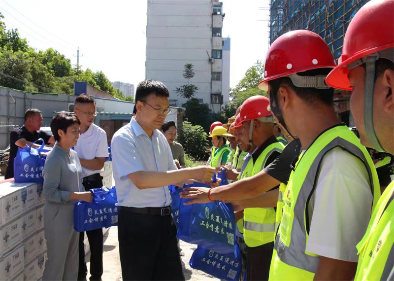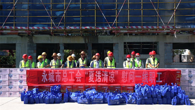 7月5日,永城市委副书记常忠伟,永城市委常委、统战部部长、副市长胡淼,永城市总工会党组书记、常务副主席冯丽娟一行不畏酷暑到城建集团八中建设项目施工现场,为一线职工送关怀。城建集团党委书记、董事长朱波,城建集团党委委员、常务副总经理苏伟,副经理王艳峰陪同慰问。